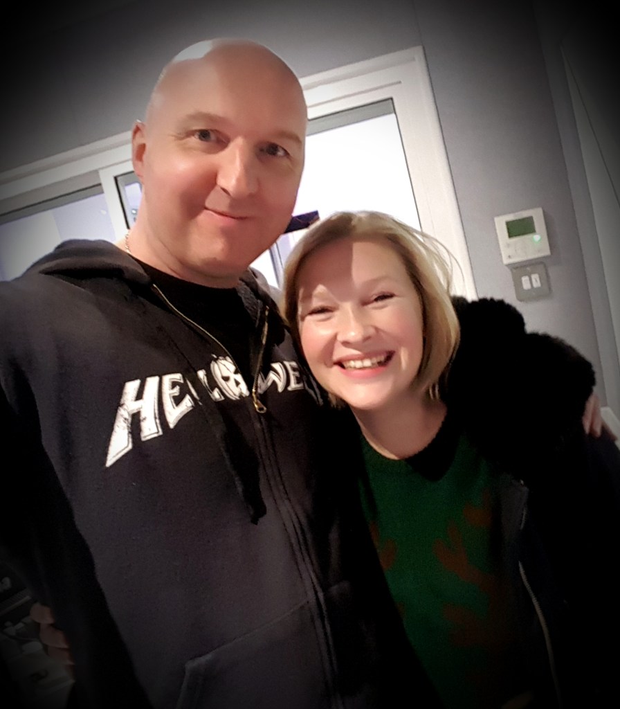 Needless to say, she was a little bundle of Christmassy joy and the voice over session was a blast. When we were done I gave her a Christmas prezzie from my station and a bag of Welsh cakes from me. I never go anywhere without Welsh cakes. Then we wandered outside as her husband was due to pick her up. He turned out to be none other than actor and VO artist James Thornton, best known for starring in Emmerdale.